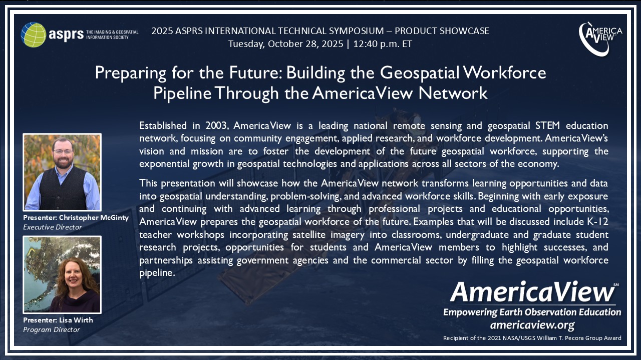 Established in 2003, AmericaView is a leading national remote sensing and geospatial STEM education network, focusing on community engagement, applied research, and workforce development. AmericaView's vision and mission are to foster the development of the future geospatial workforce, supporting the exponential growth in geospatial technologies and applications across all sectors of the economy.